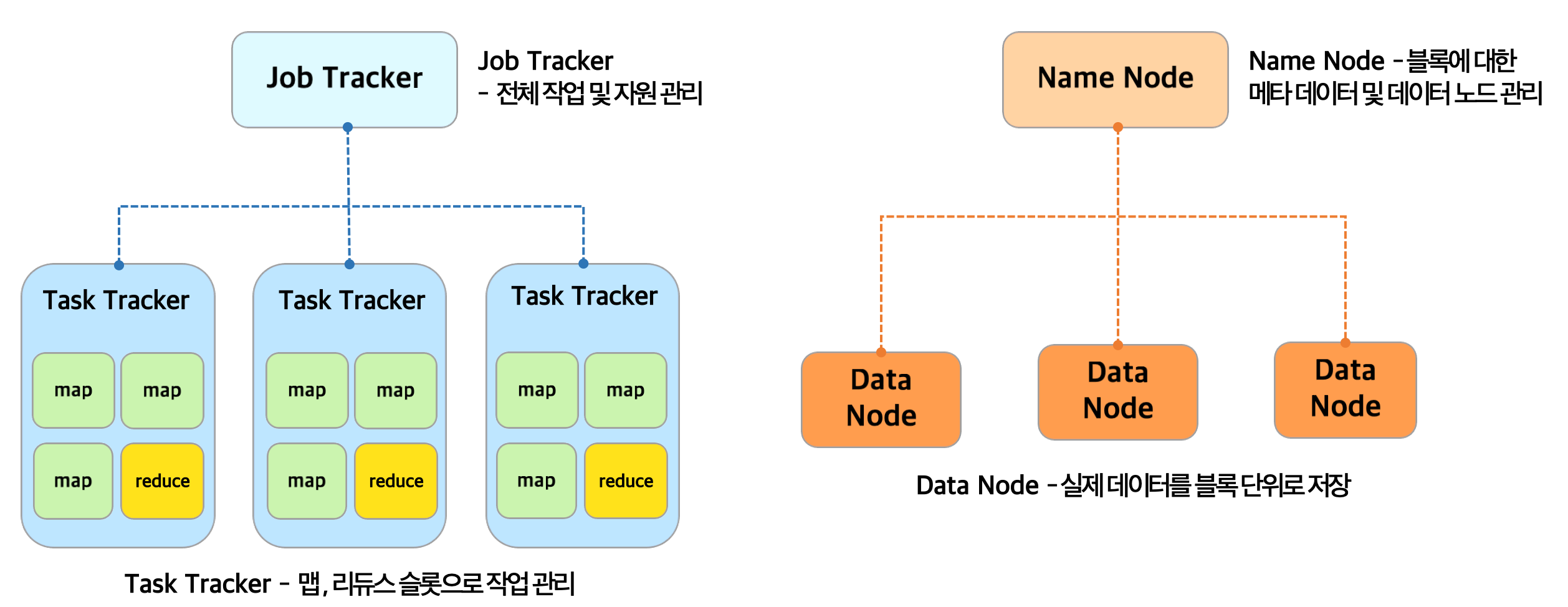 - 이러한 작업을 전체 총괄하는 담당자와 실제 작업 수행자를 분리시켰는데 이러한 역할을 하는 것이 각각 잡 트래커(Job Tracker)과 태스크 트래커(Task Tracker)이다.