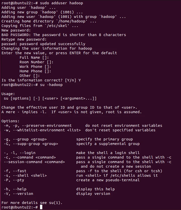 하둡 계정을 만들었으면, root 권한으로 들어가서 하둡 계정을 sudo 그룹에 추가해준다. (참고. sudo 그룹은 root 권한을 사용할 수 있는 유저 그룹이다.)