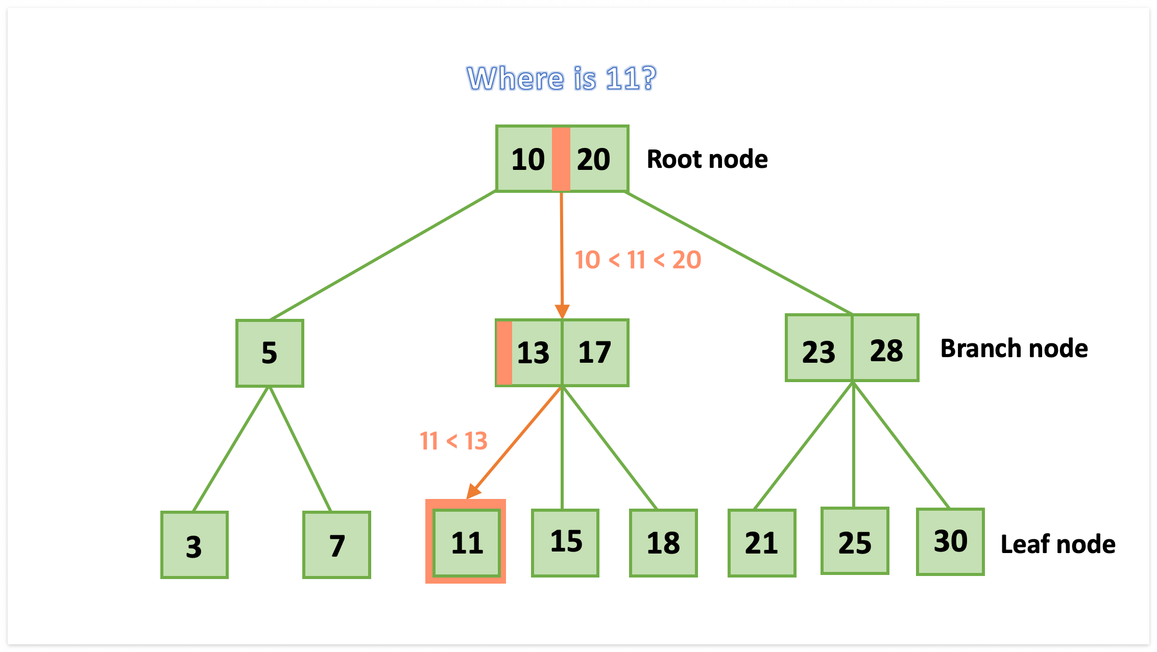 B-Tree 구조가 자주 등장하게 될 것이니 만약 이해가 어렵다면 어떤 데이터를 찾기 위해 최상단 노드에서 부터 탐색을 시작해서, 중간 노드의 도움을 받아 마지막 노드에 도달하게 된다는 정도로만 이해를 하고 넘어가도록 하자.
