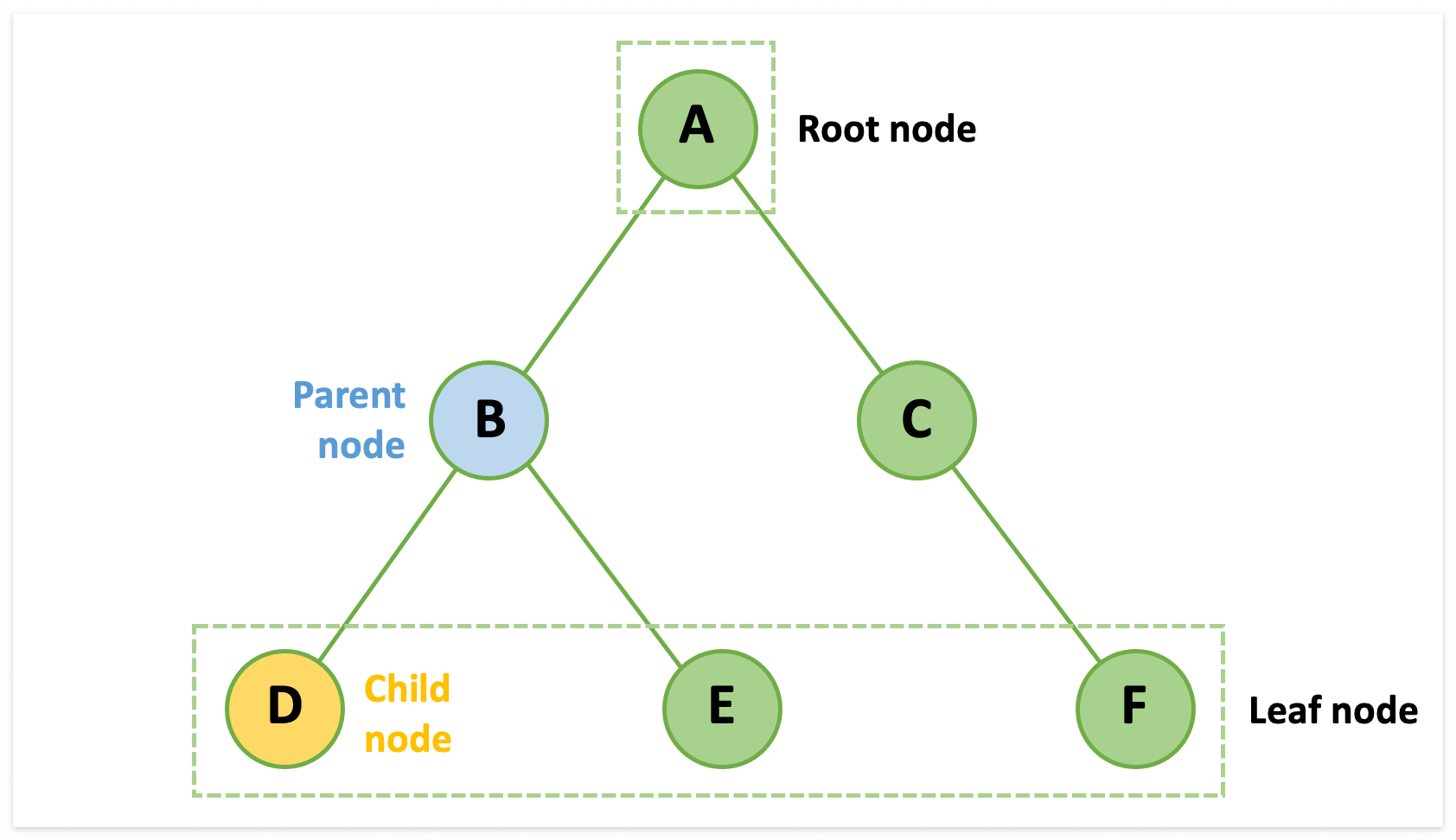 - 최상단 노드를 루트 노드(root node), 중간 노드를 브랜치 노드(branch node), 최하위 노드를 리프 노드(leaf node)라고 한다.