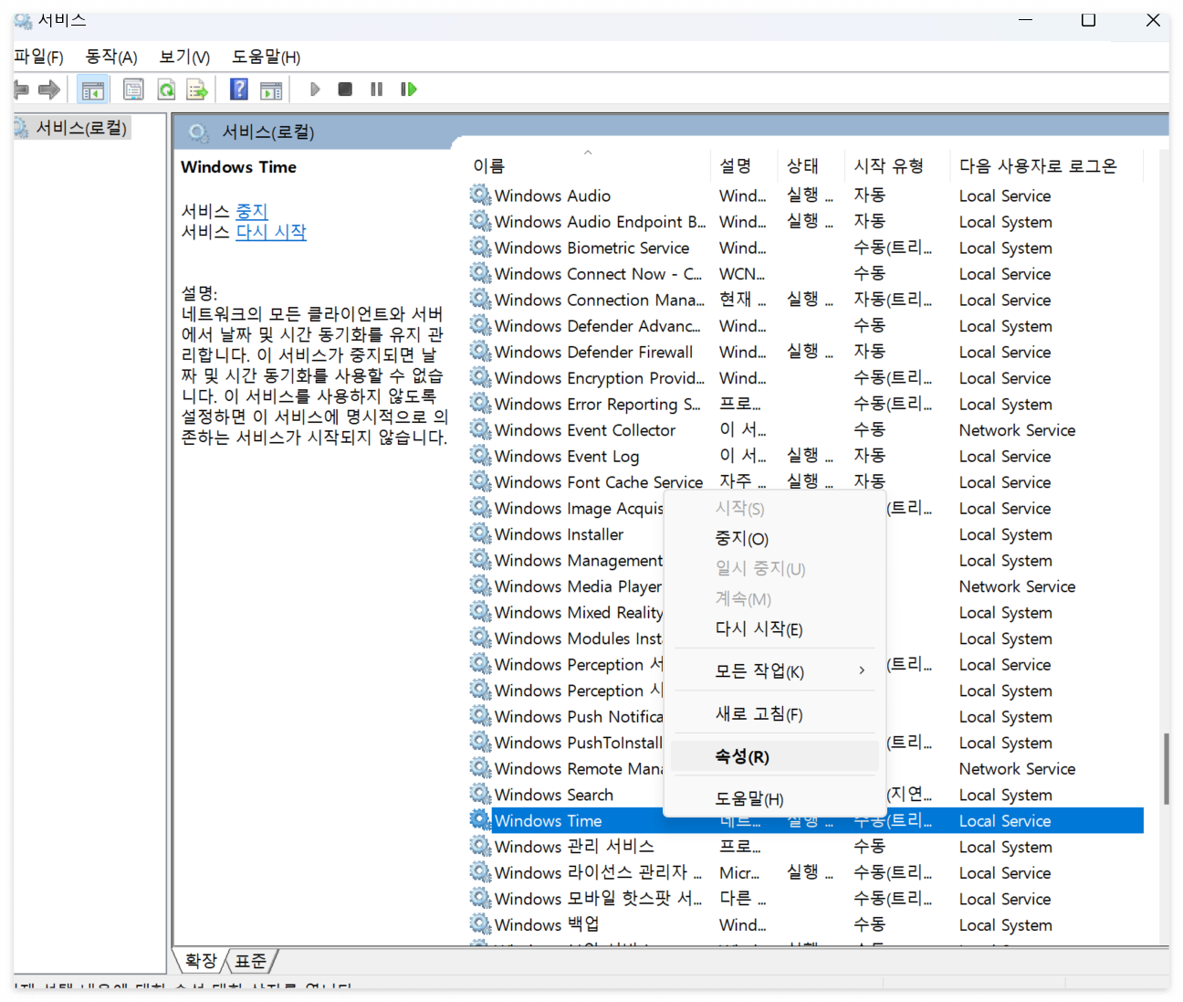 2) 서비스 목록에서 Windows Time > 오른쪽 마우스 클릭 후 [속성] 선택