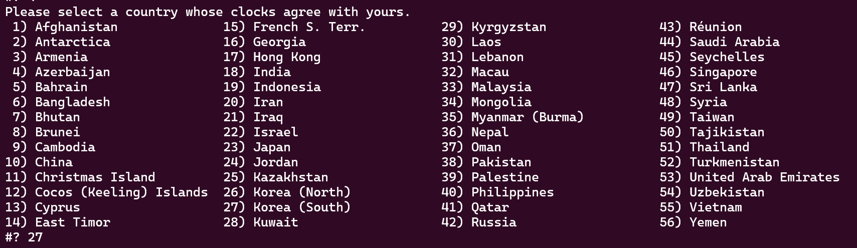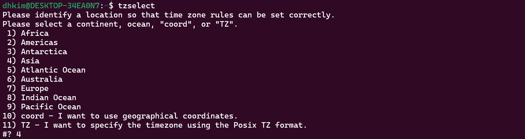 # 타임존 서울로 변경(Asia > Korea(South) > Yes를 숫자로 선택)