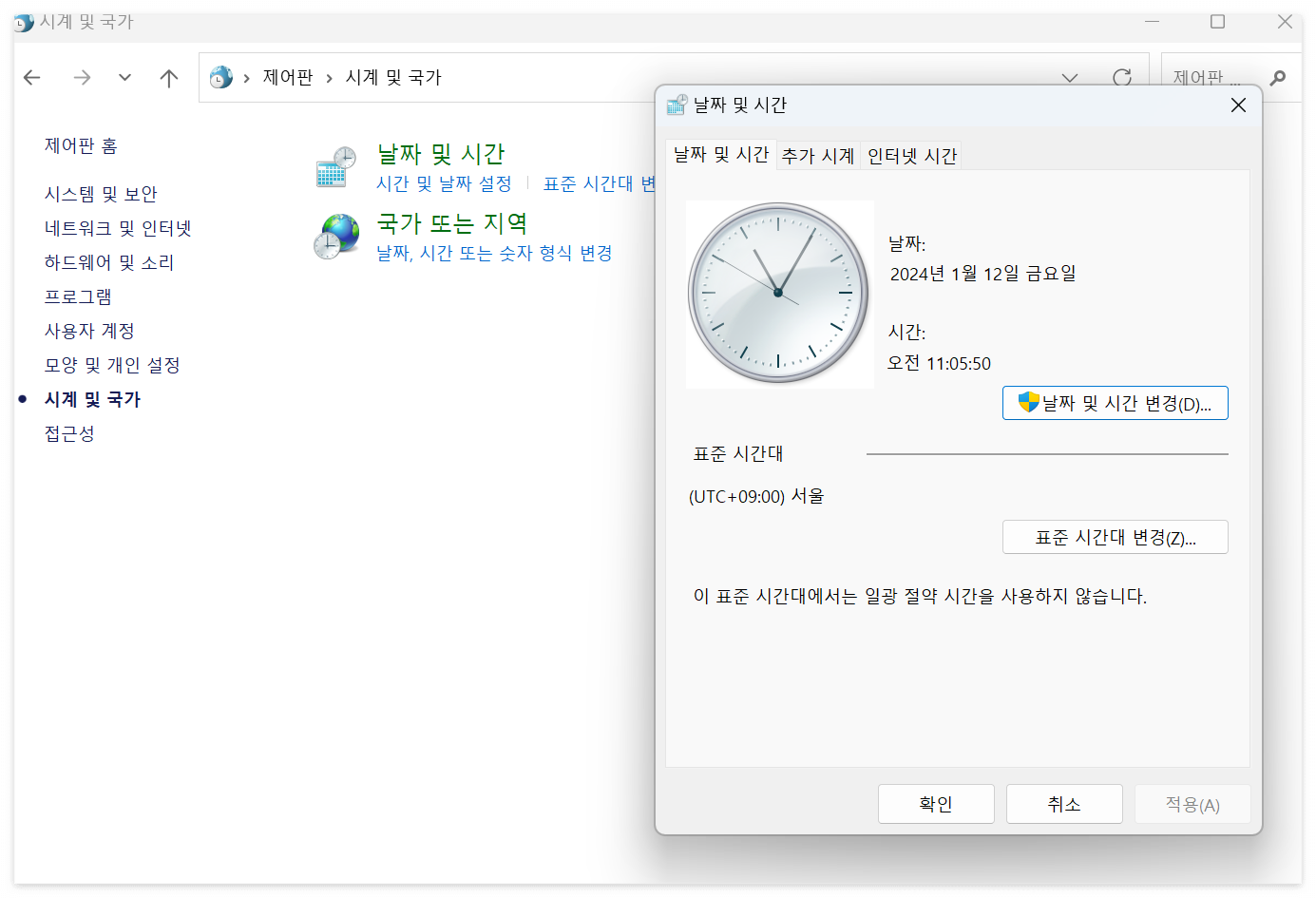 1. [제어판] > [시계 및 국가] > [날짜 및 시간] 접속