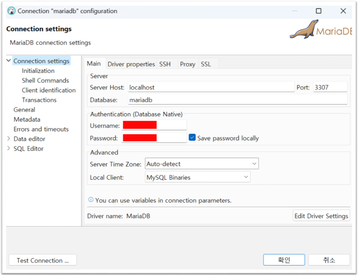 [1단계 - mariaDB 컨테이너 올리기] 3번에서 추가한 mariaDB 컨테이너 정보의 내용을 참고해서 입력하면 된다.