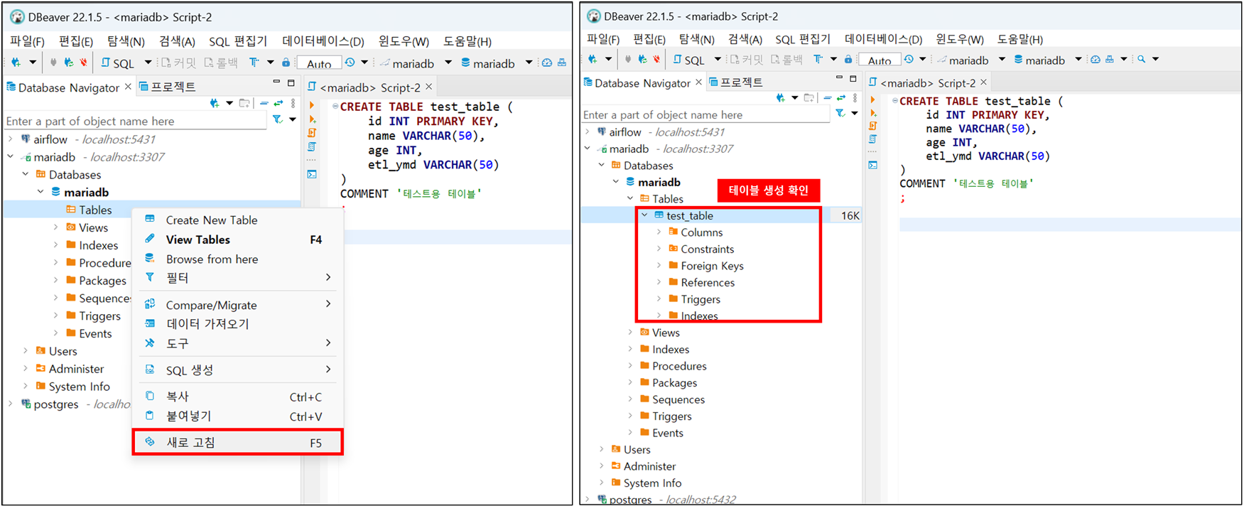 아래 쿼리 실행 후 [Tables] > 오른쪽 마우스 [새로 고침]을 하면 테이블 생성된 것을 확인할 수 있다.