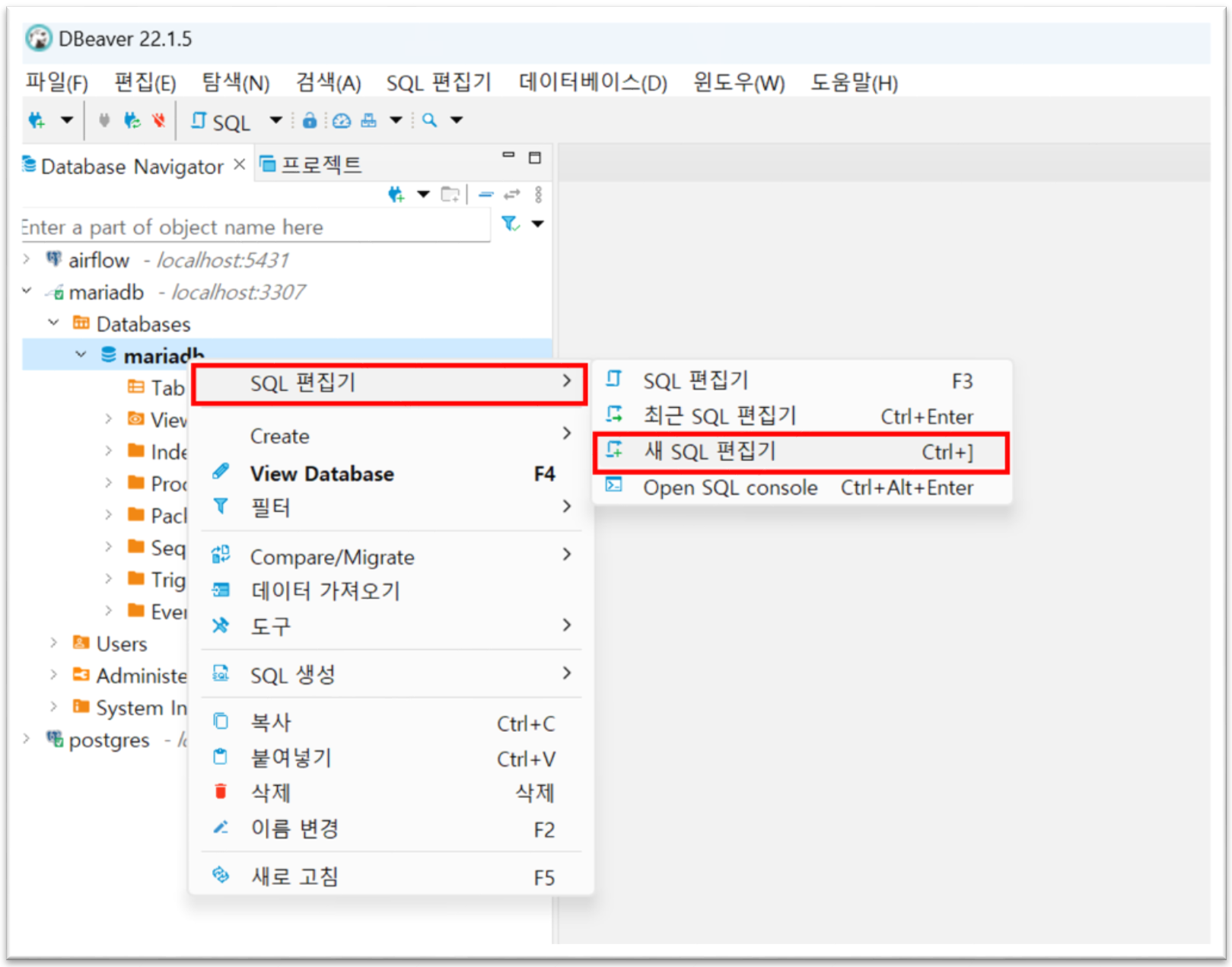 1. [mariadb] Database > 오른쪽 마우스 [SQL 편집기] > [새 SQL 편집기]
