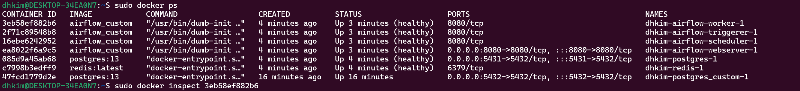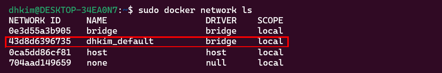 아래 명령을 통해 해당 네트워크는 dhkim_default라는 것이 확인되었고, 이와 같이 별도의 설정이 없으면 처음에는 default network를 사용함을 볼 수 있다. (참고로, dhkim은 현재 내가 접속한 유저명이다)