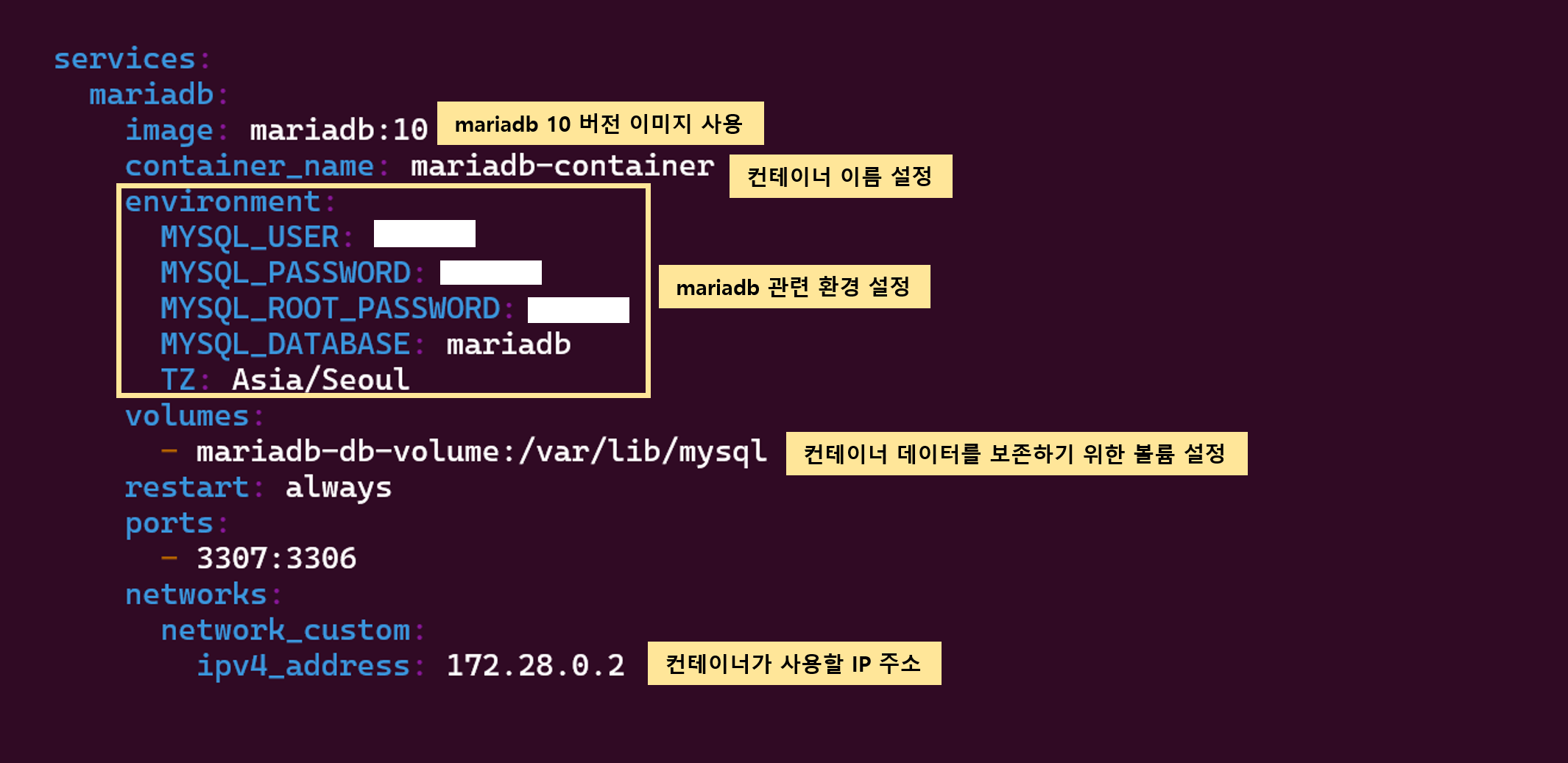 └── mariadb : 172.28.0.2 (참고로, 나의 경우 172.28.0.3을 다른 테스트용 컨테이너에서 쓰고 있어서 172.28.0.2로 지정하였음)