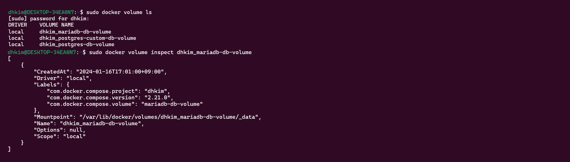 sudo docker volume inspect dhkim_mariadb-db-volume