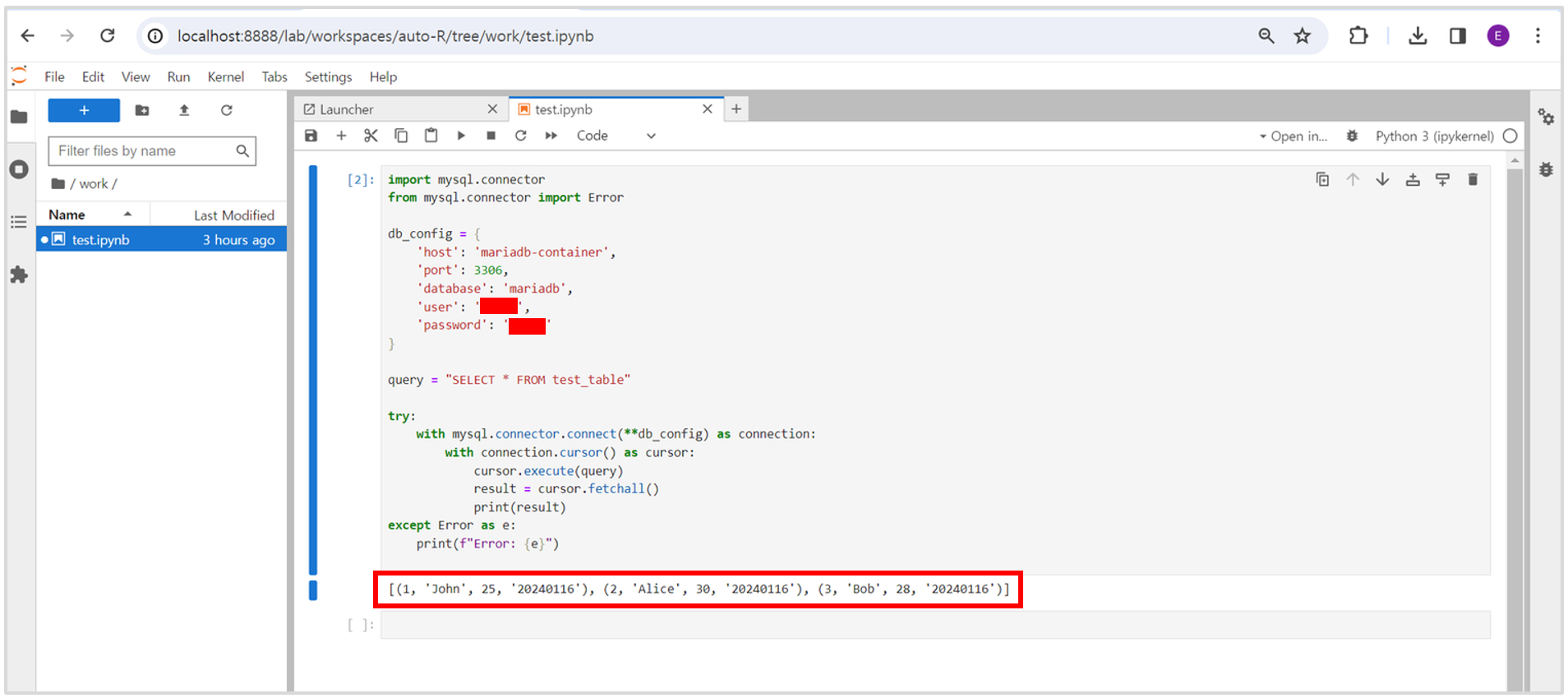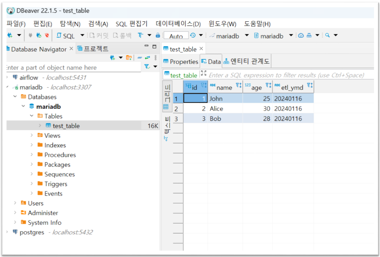 ▶db_config 정보를 이용하여 mariadb 컨테이너를 연결하고, "SELECT * FROM test_table" 쿼리를 실행하여 결과를 가져오는 코드