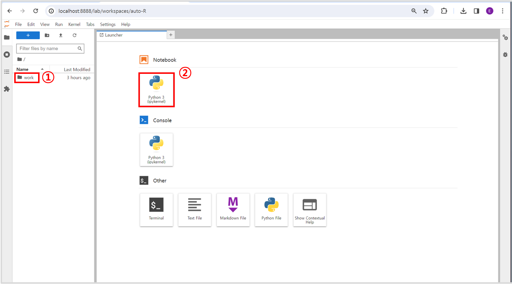 (2-2) Jupyter 화면에서 work 폴더 더블 클릭 > python3 notebook 선택 > test.ipynb 생성