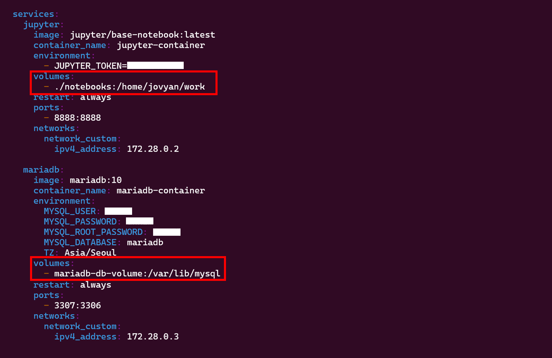 참고로, 이전 시간에 서비스들 간의 고정 IP를 지정해주었고 이 과정은 Mariadb, Jupyter 간에 같은 네트워크를 사용하고 있기에 통신이 가능한 것이다.