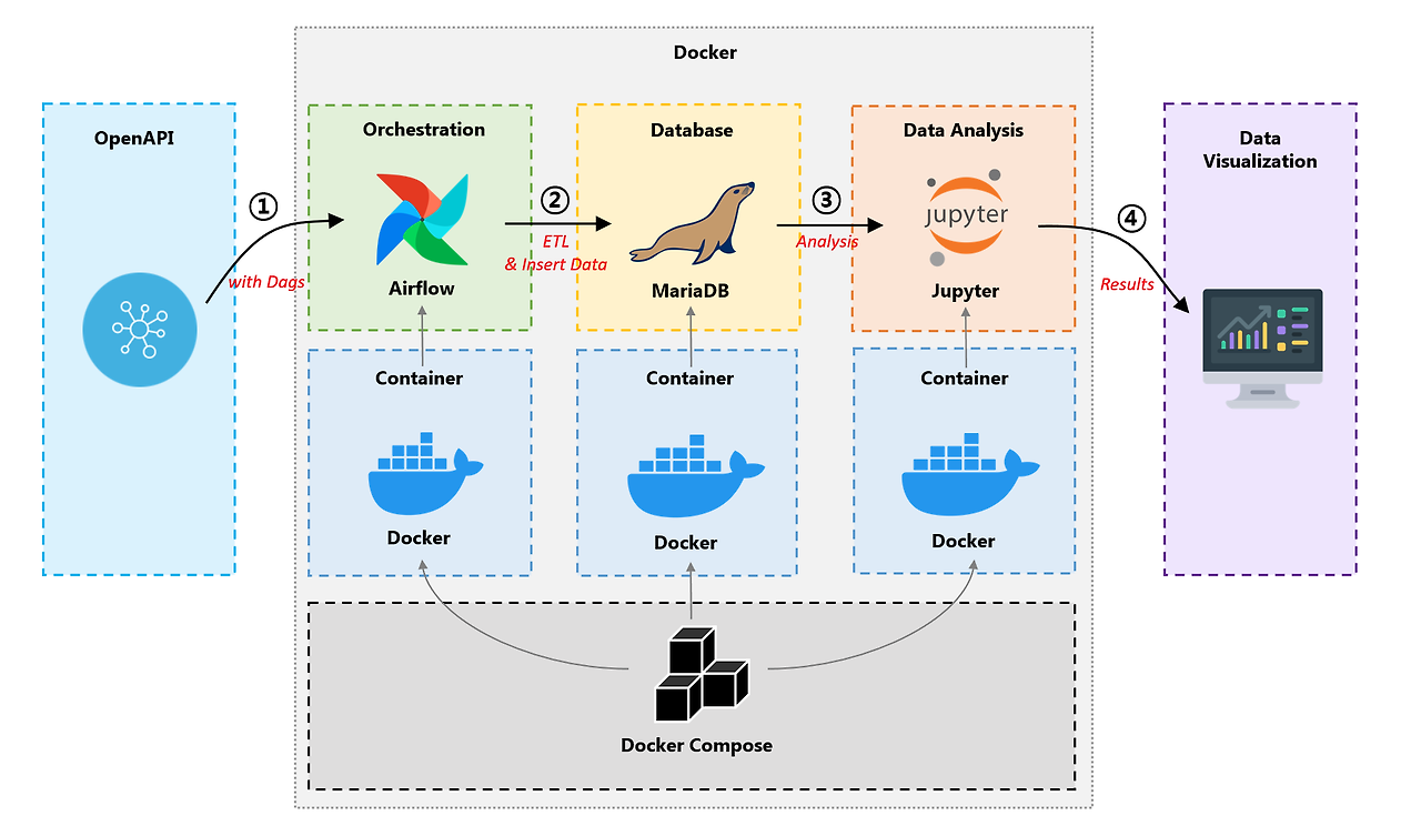 (설명) 전체적으로 아래와 같은 아키텍처를 구축하려고 하며, 3번 과정에서 Mariadb 데이터를 Jupyter로 불러오는 과정을 진행해보고자 한다.