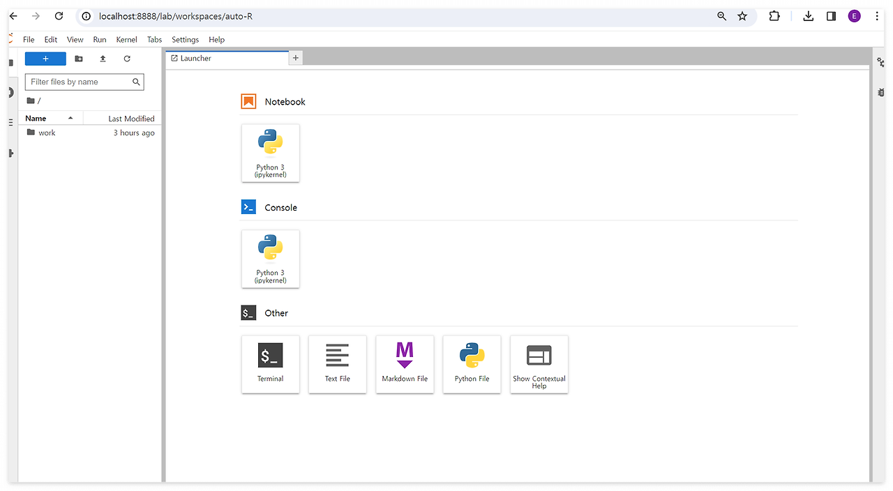 Jupyter notebook의 컨테이너 디렉터리를 /home/jovyan/work로 설정했으므로 work 디렉터리에 들어가서 코드를 생성해야한다.
