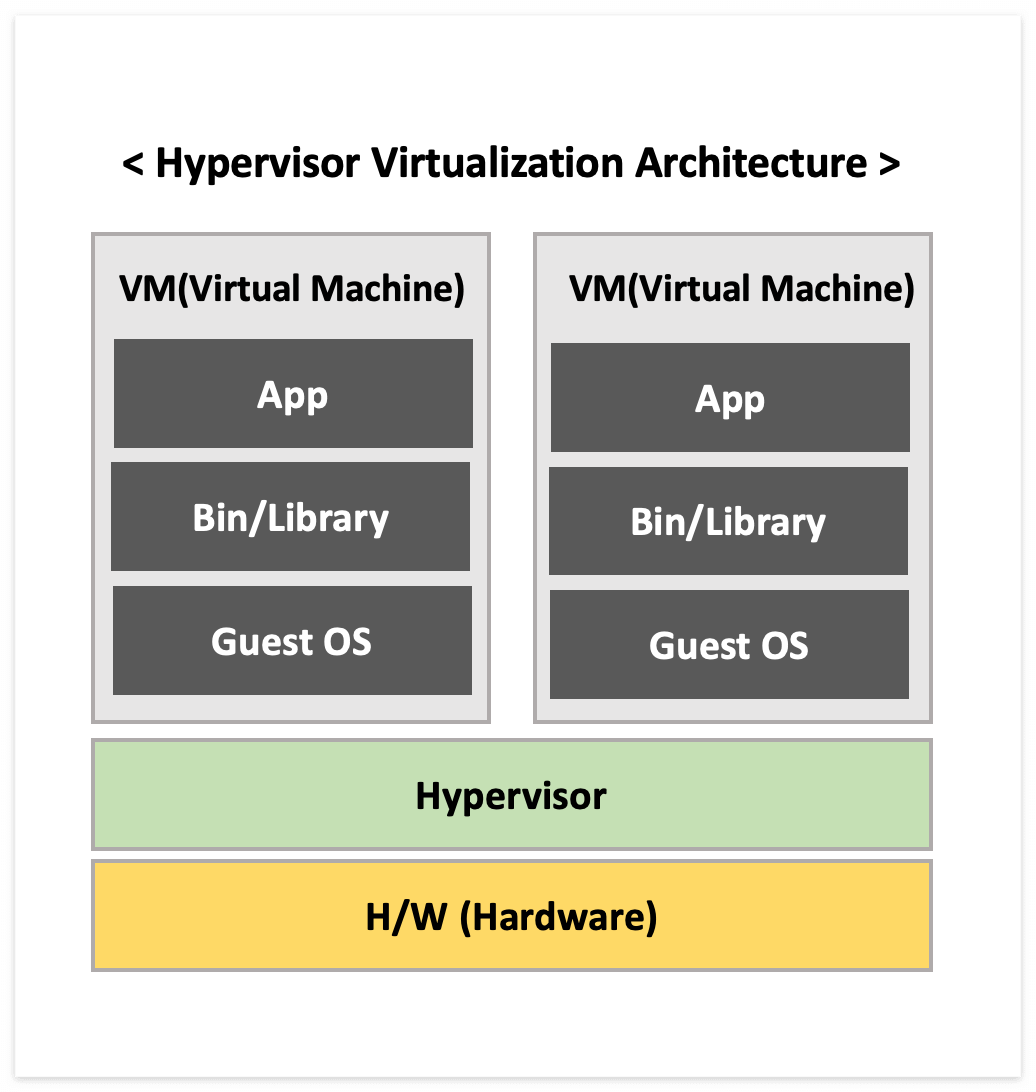 - 호스트 OS 없이 H/W 위에 Hypervisor S/W를 설치하여 사용하는 가상화 방식 → Hypervisor는 H/W와 가상 머신 간의 중재자 역할을 하며, Hypervisor가 직접 H/W를 관리하기 때문에 호스트 OS가 필요하지 않다