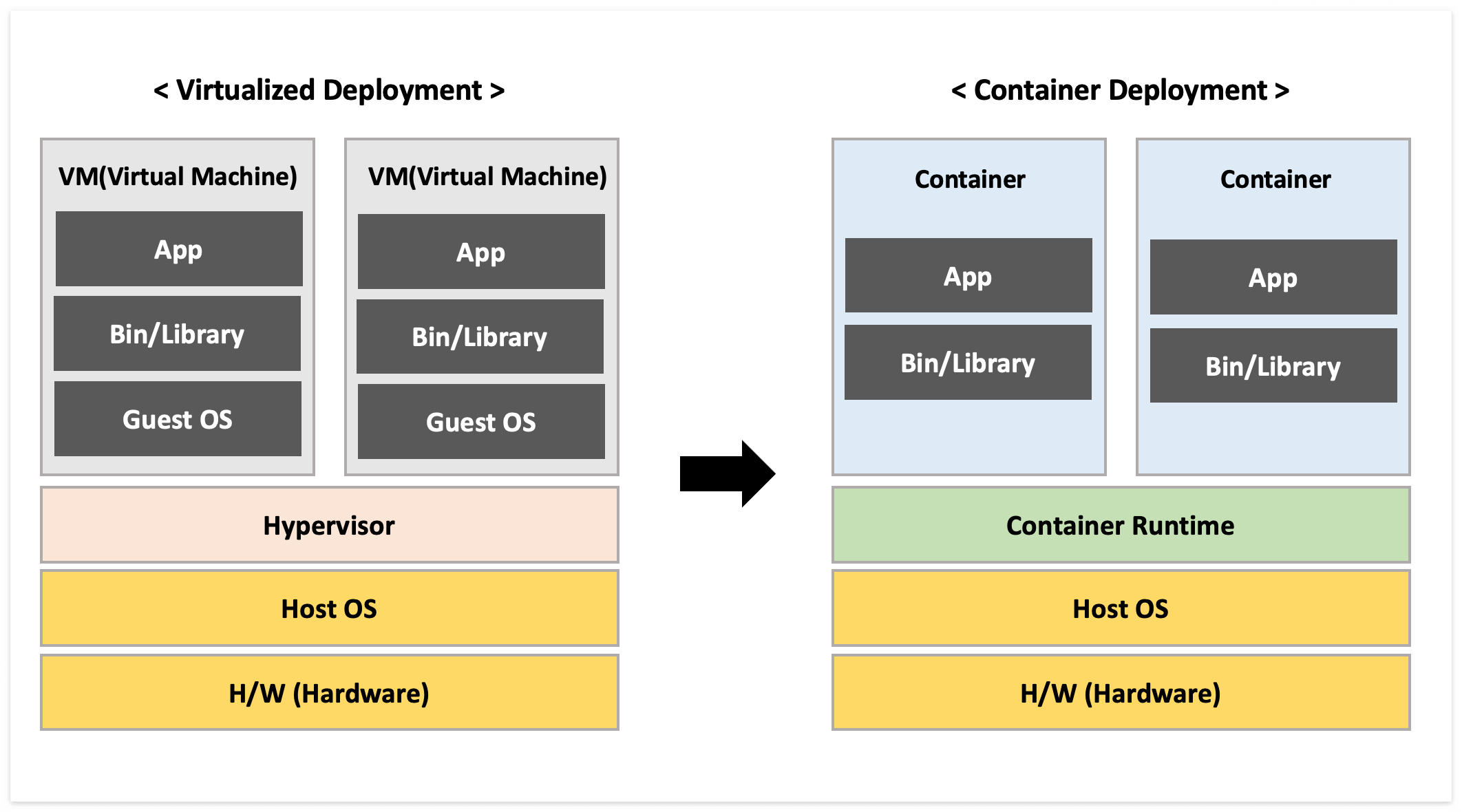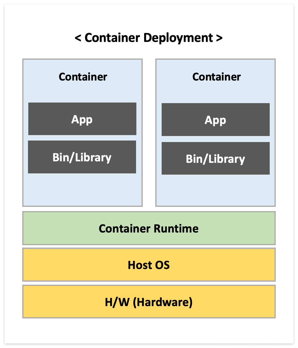 가상화 배포는 단일 물리 서버(H/W)에서 여러 가상머신(VM)을 실행할 수 있었지만, 가상머신마다 OS(게스트 OS) 설치가 필요하여 리소스를 너무 많이 사용하게 되면서 무거워졌다. 그래서 컨테이너를 도입하며 호스트 OS와 커널을 공유하면서 이전보다 가벼운 가상화 구현이 가능해지게 되었다.