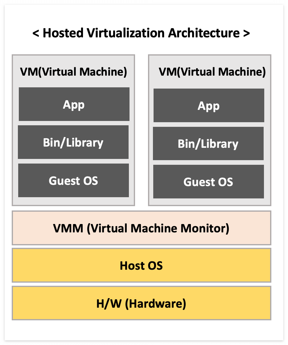 - 물리머신(H/W) 위에 OS를 설치하고, 그 위에 가상화 S/W(ex. VirtualBox)와 가상머신을 움직이는 방식
